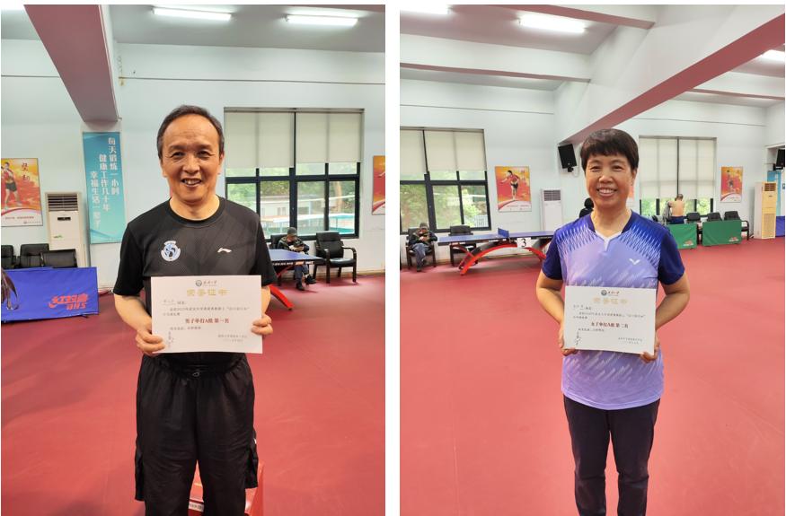经过激烈比拼,黄汉平、郭园园两位老师脱颖而出,分别斩获男子单打A组(55-65岁)冠军、女子单打A组(55-65岁)亚军。他们以精湛的球技和昂扬的斗志,生动展现了出版社离退休教职工奋勇争先的精神风貌,特此向两位老师致以热烈祝贺!